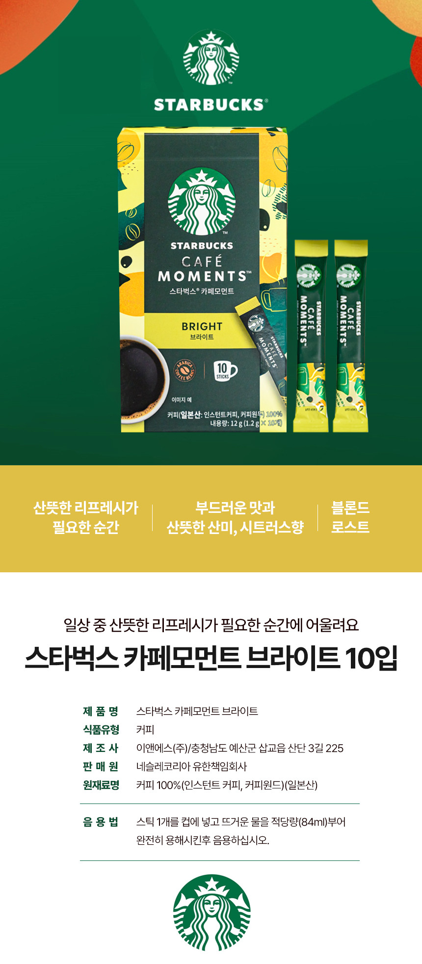 [업체별도배송]스타벅스 카페모먼트 브라이트 (1.2g*10T/네슬레코리아)